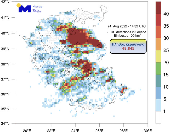 Όπως χαρακτηριστικά αναφέρει το meteo, το σύστημα Ζευς κατέγραψε σχεδόν 50.000 κεραυνούς έως τις 5 το απόγευμα στην Ελλάδα! Μεγάλα ήταν και τα ύψη βροχής που καταγράφηκαν σε πολλές περιοχές.