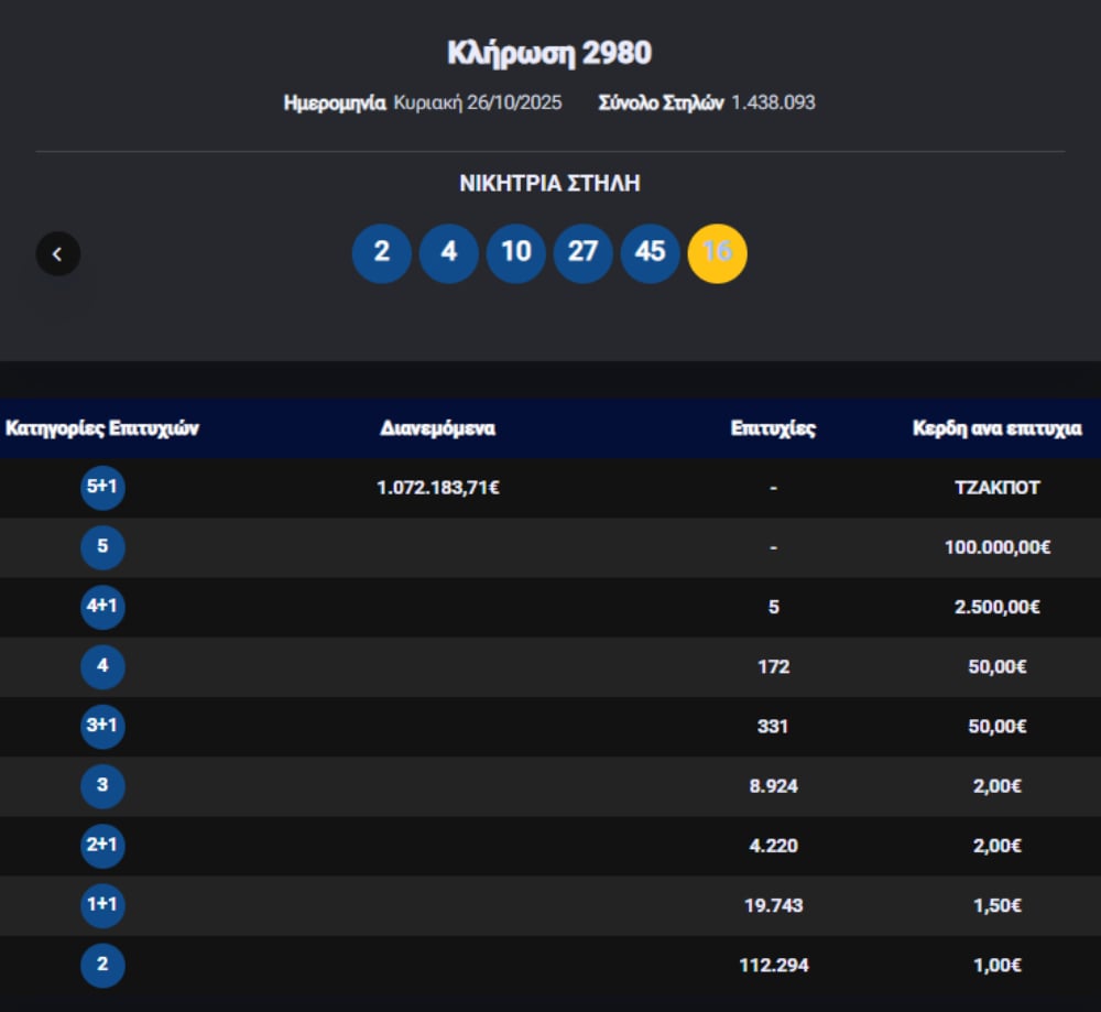 Στην πρώτη κατηγορία (5+1 νούμερα) σημειώθηκε νέο τζακ ποτ, ενώ τζακ ποτ υπήρξε και στη δεύτερη κατηγορία (5 νούμερα), καθώς ούτε εκεί βρέθηκε τυχερός.
