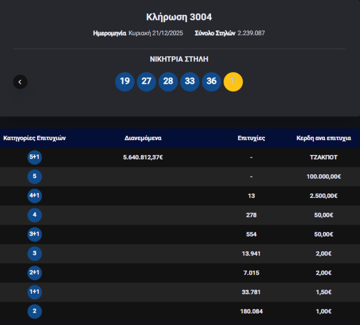 Στην πρώτη κατηγορία (5+1 νούμερα) σημειώθηκε ένα ακόμη σερί τζακ ποτ, ενώ απόψε στη δεύτερη κατηγορία (5 νούμερα) σημειώθηκε επίσης τζακ ποτ.
