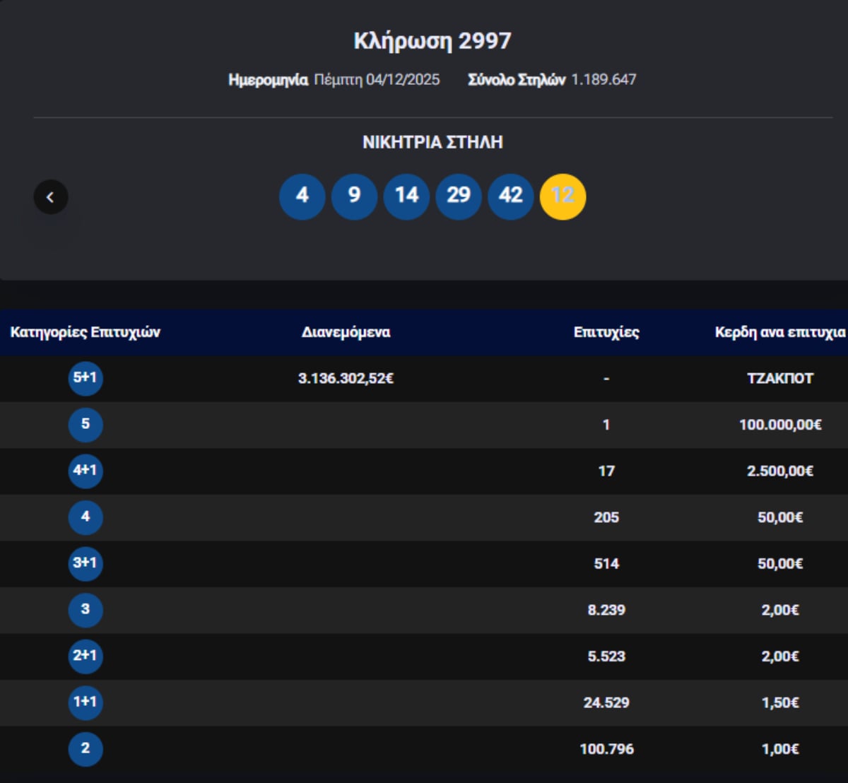 Στην πρώτη κατηγορία (5+1 νούμερα) σημειώθηκε ένα ακόμη σερί τζακ ποτ, ενώ στη δεύτερη κατηγορία (5 νούμερα) και απόψε βρέθηκε ένας τυχερός, ο οποίος κερδίζει 100.000 ευρώ.