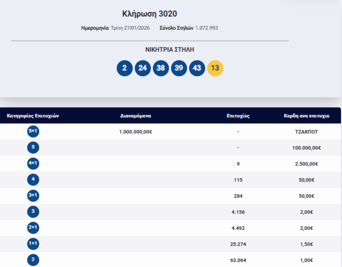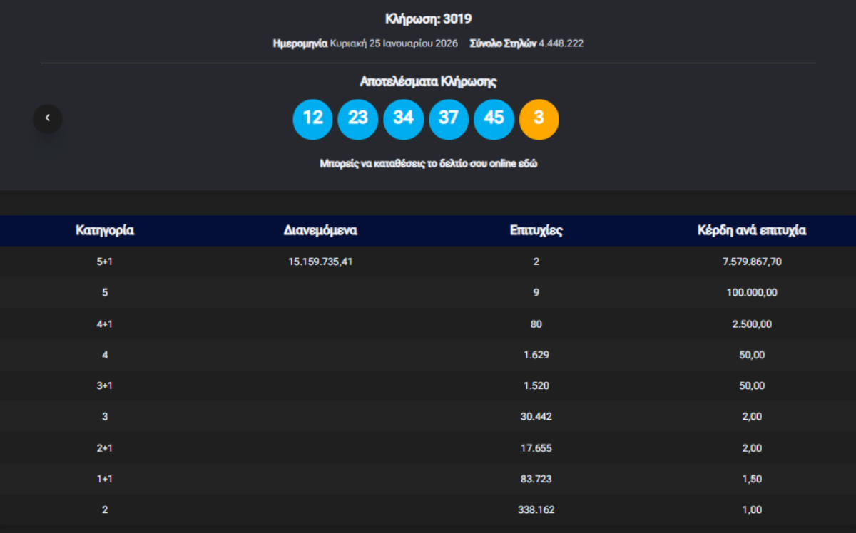 Τζακ ποτ σημειώθηκε απόψε στην πρώτη κατηγορία (5+1 νούμερα), ενώ τζακ ποτ σημειώθηκε και στη δεύτερη κατηγορία (5 νούμερα).