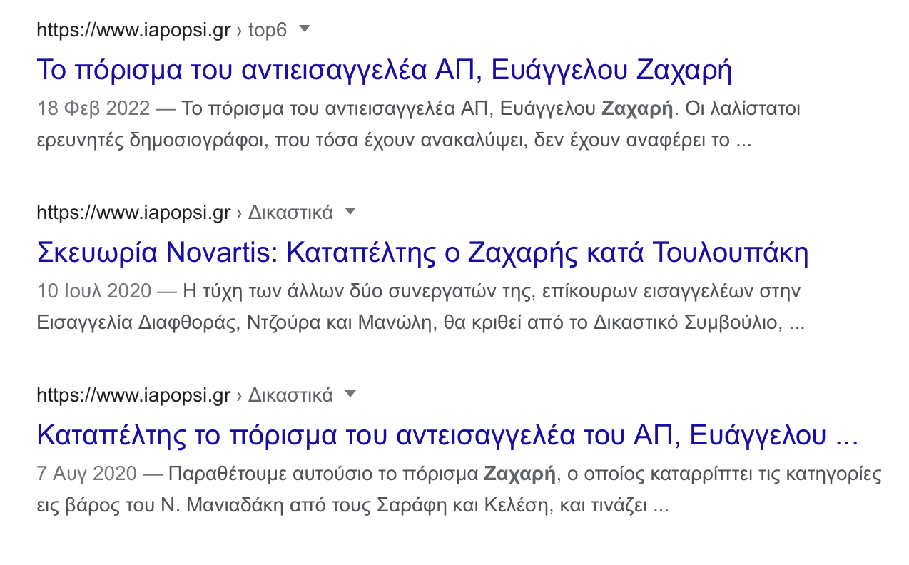 «Σύμφωνα με πληροφορίες, ο κ. Ζαχαρής έχει εκδηλώσει τη θέση του να απόσχει από την έρευνα για τη Novartis, με τη δικαιολογία κάποιου προβλήματος υγείας. Η πραγματικότητα όμως είναι ότι «κάποιοι» του συνέστησαν να απόσχει από την έρευνα, θυμίζοντάς του κάποια πειθαρχική εμπλοκή του προ 20ετίας, εμπλοκή ροζ περιεχομένου για την οποία ο εν λόγω εισαγγελέας ετέθη τότε σε αργία και με απόφαση του Πειθαρχικού Συμβουλίου, με ψήφους 8-7, δεν τιμωρήθηκε με την ποινή της απόταξης».