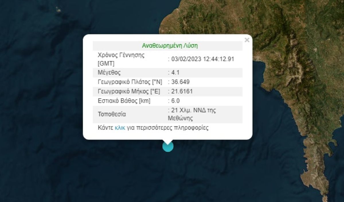 Σύμφωνα με την ενημέρωση του Γεωδυναμικού Ινστιτούτου, η δόνηση καταγράφηκε στα 21 χιλιόμετρα νότια – νοτιοδυτικά της Μεθώνης, ενώ το εστιακό βάθος ήταν στα 6 χιλιόμετρα.