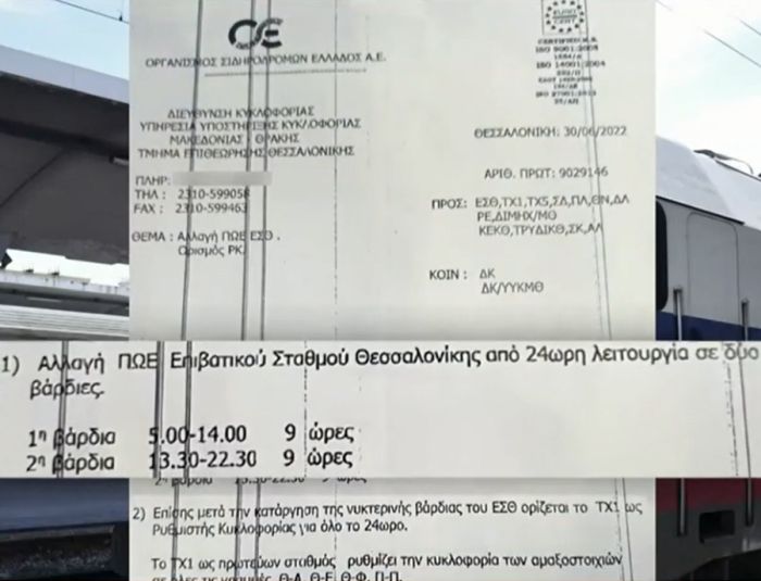«Επίσης, μετά την κατάργηση της νυχτερινής βάρδιας του ΕΣΘ, ορίζεται το ΤΧ1 (σ.σ. ο μεγαλύτερος σιδηροδρομικός κόμβο της χώρας, όπου συναντώνται οι γραμμές της Αθήνας, της Ειδομένης και της Αλεξανδρούπολης) ως Ρυθμιστής Κυκλοφορίας για όλο το 24ωρο. Το ΤΧ1 ως πρωτεύων σταθμός ρυθμίζει την κυκλοφορία των αμαξοστοιχιών σε όλες τις γραμμές Θ-Α, Θ-Ε, Θ-Φ, Π-Π», αναγράφει ακόμα το έγγραφο, για έναν σταθμό (ΤΧ1) που είναι σχεδόν διαλυμένος.