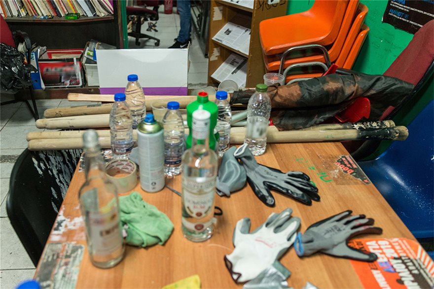 Επίσης, βρήκαν και υλικά για κάλυψη χαρακτηριστικών προσώπου,πυροσβεστήρες, διαρρηκτικά εργαλεία, φυλλάδια αναρχικού περιεχομένου, κομμάτια από μάρμαρα και πέτρες που θα τα χρησιμοποιούσαν σε επιθέσεις.
