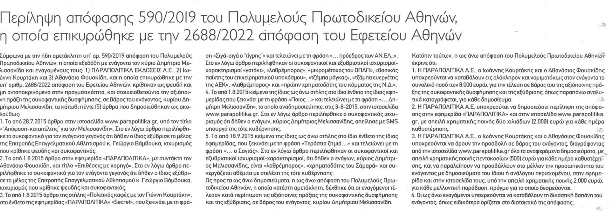 Σύμφωνα με την ήδη αμετάκλητη υπ’αρ. 590/2019 απόφαση του Πολυμελούς Πρωτοδικείου Αθηνών, η οποία επικυρώθηκε με την υπ΄αριθμ. 26/88/2022 απόφαση του Εφετείου Αθηνών, κρίθηκαν ως ψευδή και συκοφαντικά 5 δημοσιεύματα των Παραπολιτικών του ομίλου Μαρινάκη.