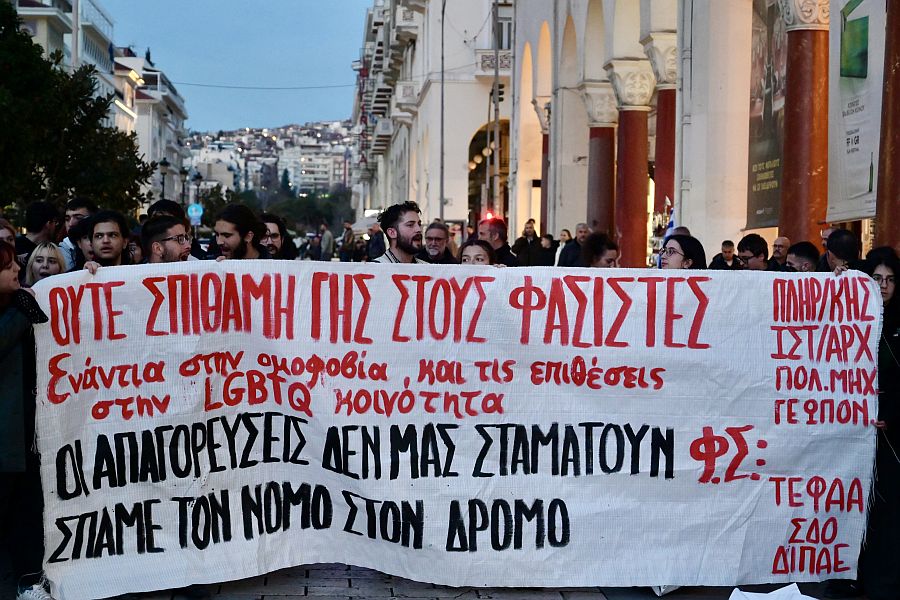 Διαδηλωτές συγκεντρώθηκαν έξω από το Κινηματοθέατρο Ολύμπιον λίγο πριν την έναρξη της προβολής του ντοκιμαντέρ, με τους αστυνομικούς να τους ενημερώνουν ότι έχει τεθεί σε ισχύ απαγόρευση συγκεντρώσεων.
