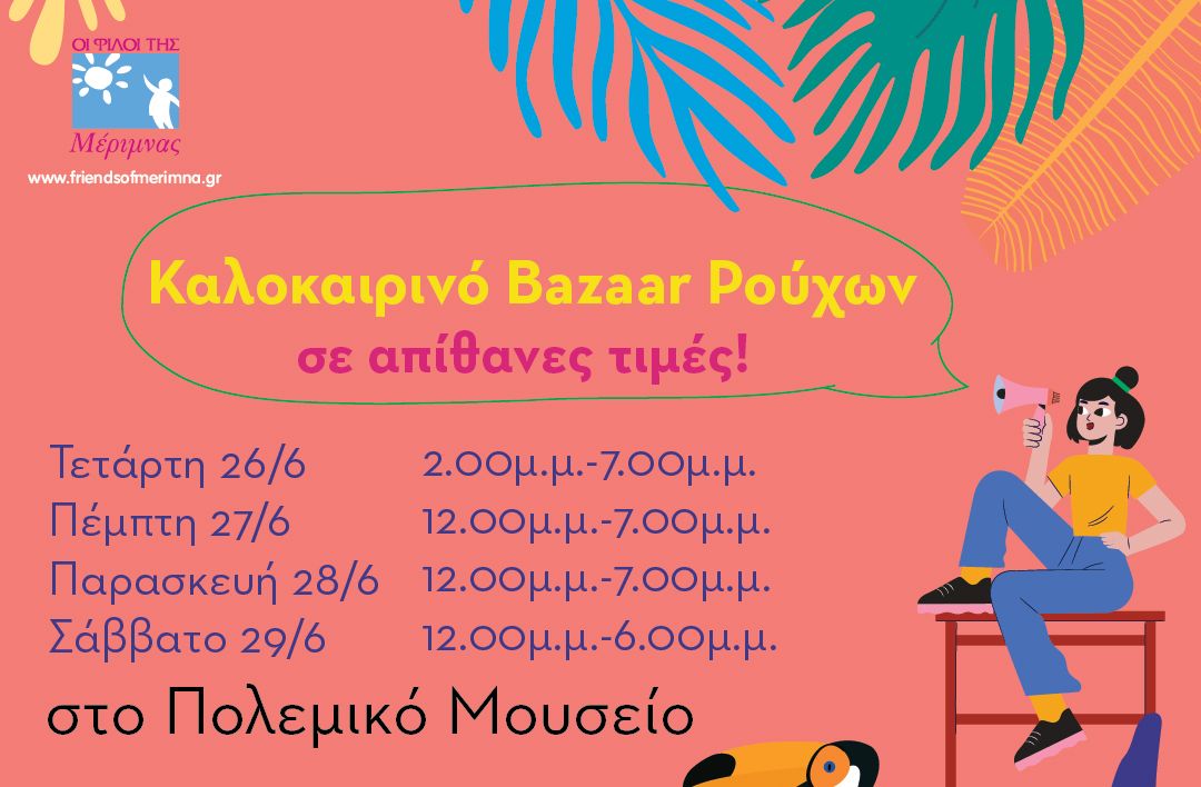 Στο Καλοκαιρινό Bazaar Ρούχων, που θα πραγματοποιηθεί μεταξύ 26-29/6, στο Πολεμικό Μουσείο, Ριζάρη 2, στην Αθήνα, θα βρείτε αντρικά και γυναικεία ρούχα και αξεσουάρ.