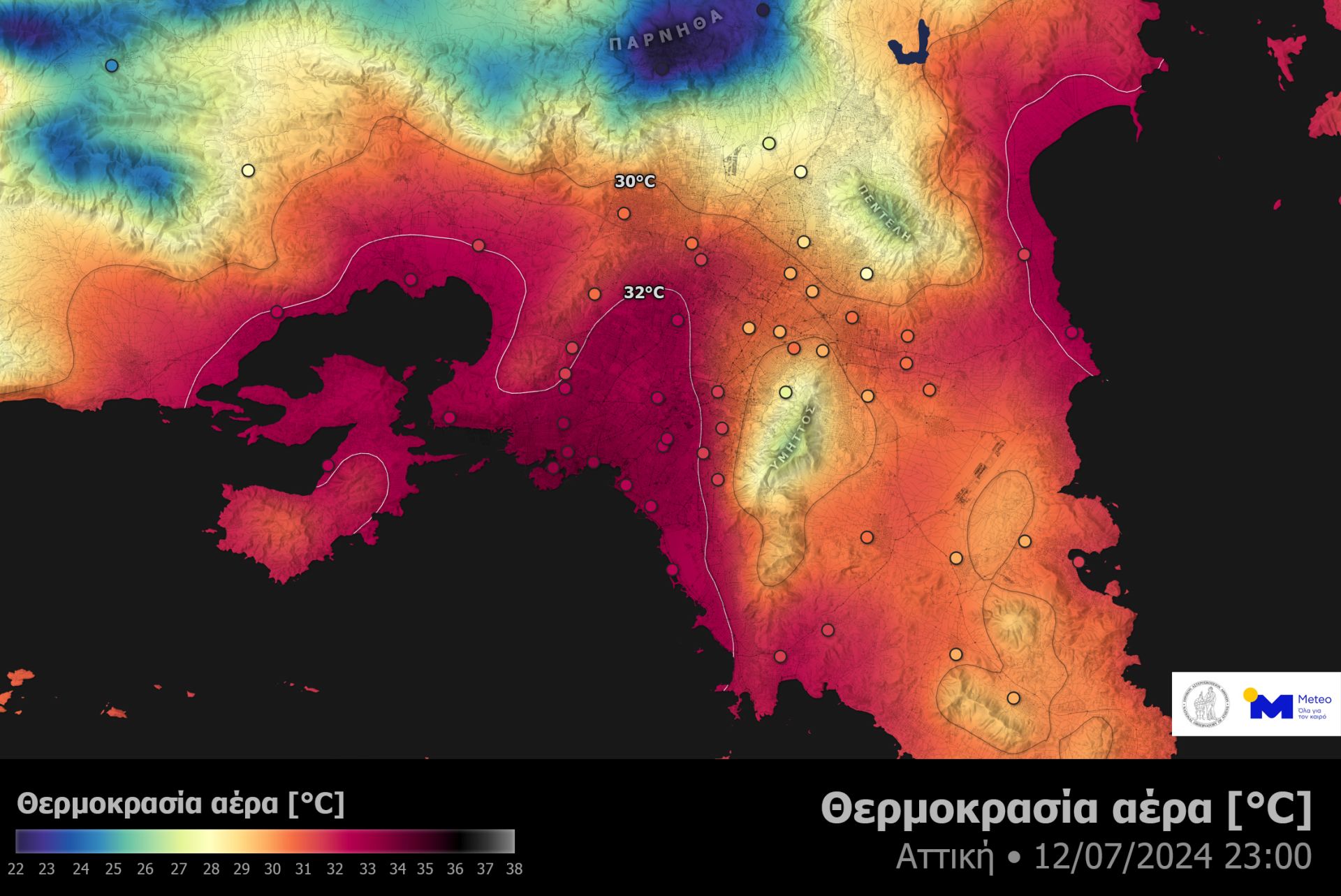 Στον παρακάτω χάρτη αποτυπώνεται η θερμοκρασία αέρα όπως υπολογίστηκε από τις καταγραφές του δικτύου αυτόματων μετεωρολογικών σταθμών του meteo.gr/Εθνικού Αστεροσκοπείου Αθηνών στις 23:00 το βράδυ της Παρασκευής στην περιοχή της Αττικής.