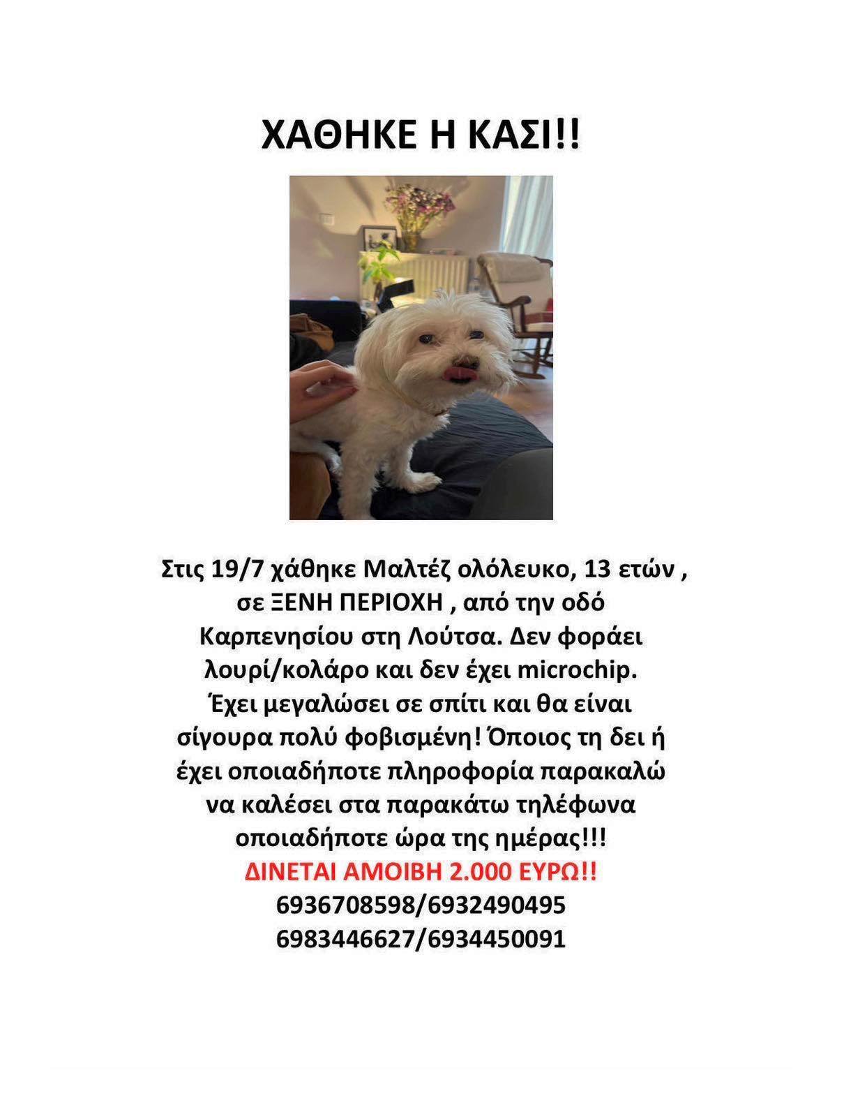 Στην περιοχή της Λούτσας χάθηκε την περασμένη Παρασκευή, 19/7, η Κάσι, ένα ολόλευκο μαλτεζάκι, η οποία δεν φοράει κολάρο, ούτε έχει microchip, αλλά σίγουρα είναι φοβισμένη.