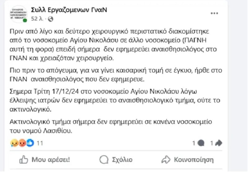 Όπως εξηγεί ο Πρόεδρος του Συλλόγου Εργαζομένων Νοσοκομείου Αγίου Νικολάου, κ. Γιώργος Μανουσάκης, υπάρχουν πάρα πολλά κενά στις εφημερίες και αυτό έχει ως αποτέλεσμα αρκετά περιστατικά να διακομίζονται αλλού.