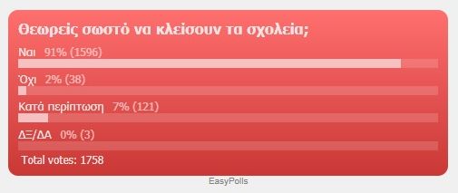 Χθες ημέρα Τρίτη 9 Μαρτίου στις 15:58 το newsbreak.gr άνοιξε την πλατφόρμα για δημοσκόπηση με θέμα #Κλείστε_τα_σχολεία_τώρα και με ερώτημα: «Θεωρείς σωστό να κλείσουν τα σχολεία»