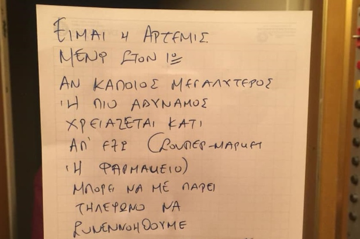 Συγκεκριμένα, το σημείωμα αναφέρει: «Είμαι η Άρτεμις. Μένω στον 1ο. Αν κάποιος μεγαλύτερος ή πιο αδύναμος χρειάζεται κάτι απ’ έξω (Σούπερ Μάρκετ ή φαρμακείο) μπορεί να με πάρει τηλέφωνο να συνεννοηθούμε)».