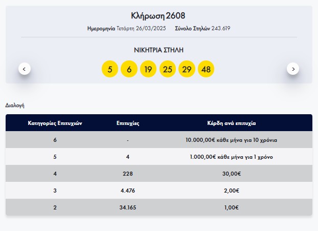 Πραγματοποιήθηκε το βράδυ της Τετάρτης η κλήρωση ΟΠΑΠ του ΛΟΤΤΟ. Οι τυχεροί αριθμοί που ανέδειξε η κληρωτίδα είναι οι: 25, 19, 5, 6, 29, 48.