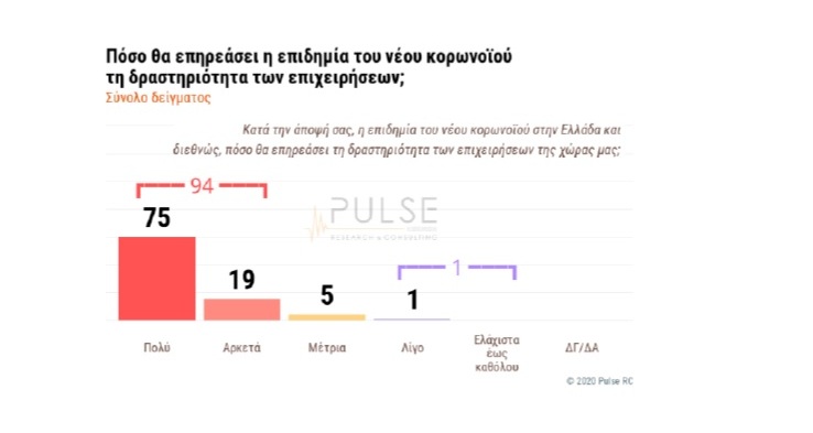 Επιπλέον, σχεδόν όλοι (94%) εκτιμούν ότι η πανδημία και οι συνέπειες θα επηρεάσει αρνητικά τη δραστηριότητα των επιχειρήσεων στη χώρα μας. Μάλιστα, μαζί με τα ελληνοτουρκικά θα επηρεάσουν την πορεία της ελληνικής οικονομίας, αρνητικά, πιστεύει το 86%.