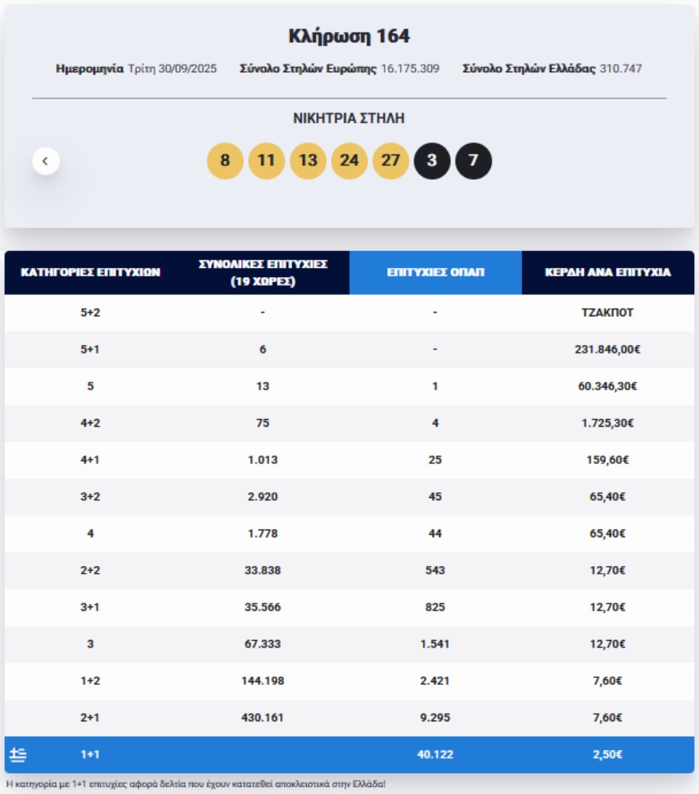 Οι αριθμοί που κερδίζουν είναι οι: 8, 11, 13, 24, 27 και 3, 7.
