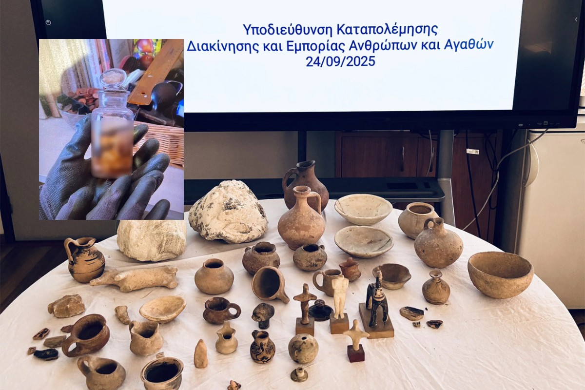 Κατά την έρευνα, οι αστυνομικοί εντόπισαν δεκάδες αντικείμενα που υπάγονται στον νόμο περί αρχαιοτήτων, ανάμεσά τους αγγεία, βιβλία και πίνακες, τα οποία –σύμφωνα με τις αρχές– αποτελούν μέρος της πολιτιστικής κληρονομιάς των Κυκλάδων. Ωστόσο, το εύρημα που προκάλεσε σοκ ήταν το ανθρώπινο έμβρυο μέσα στο μπουκάλι.