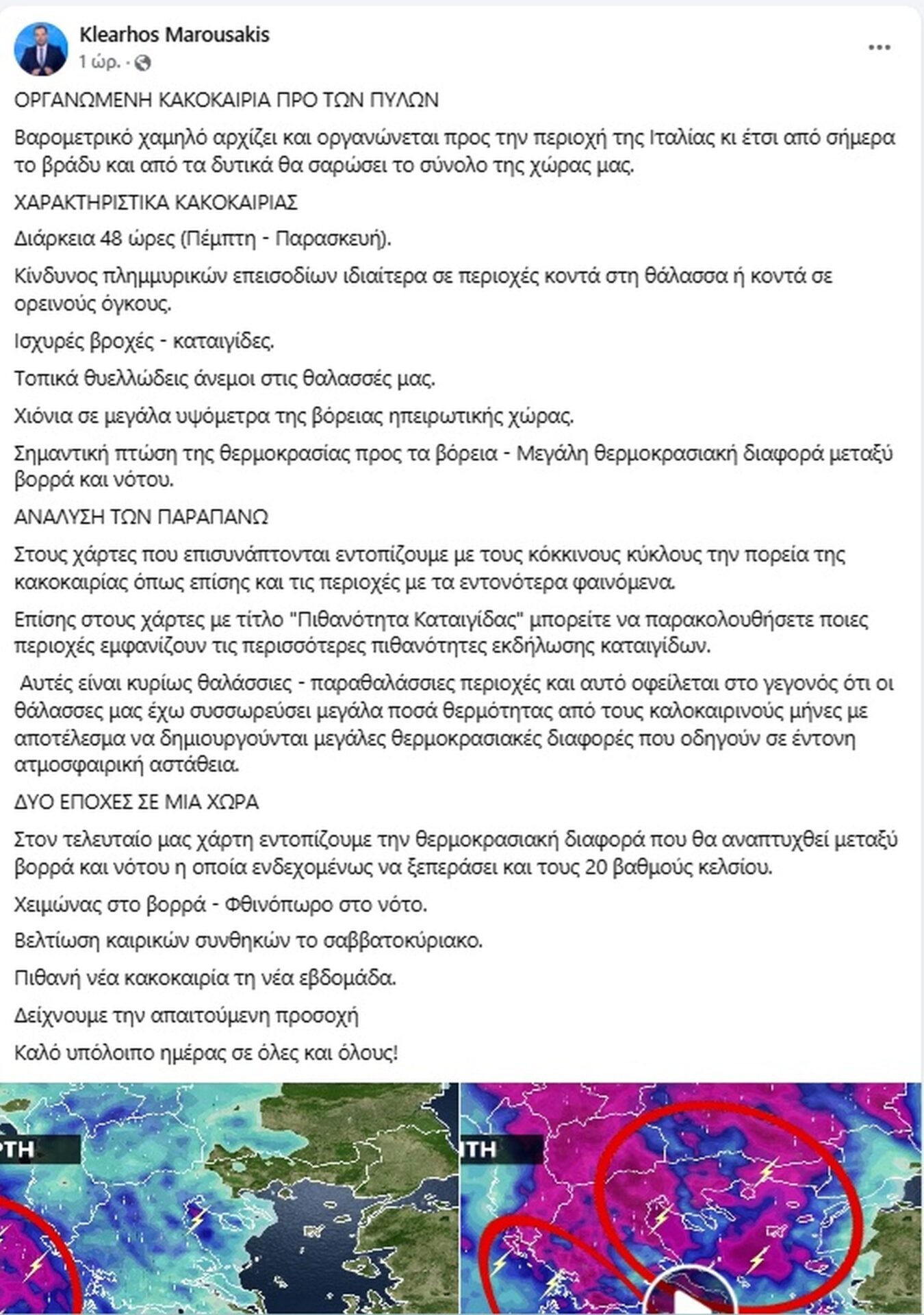 Σύμφωνα με την ανάρτηση του μετεωρολόγου Κλέαρχου Μαρουσάκη, ένα ισχυρό βαρομετρικό χαμηλό οργανώνεται προς την Ιταλία και θα κινηθεί γρήγορα ανατολικά, επηρεάζοντας και την Ελλάδα με επικίνδυνα φαινόμενα. Η κακοκαιρία θα διαρκέσει δύο εικοσιτετράωρα (Πέμπτη – Παρασκευή), με κύρια χαρακτηριστικά τις ισχυρές βροχές και καταιγίδες, τους θυελλώδεις ανέμους, τις χιονοπτώσεις σε μεγάλα υψόμετρα και την απότομη πτώση της θερμοκρασίας, ιδιαίτερα στη βόρεια χώρα.