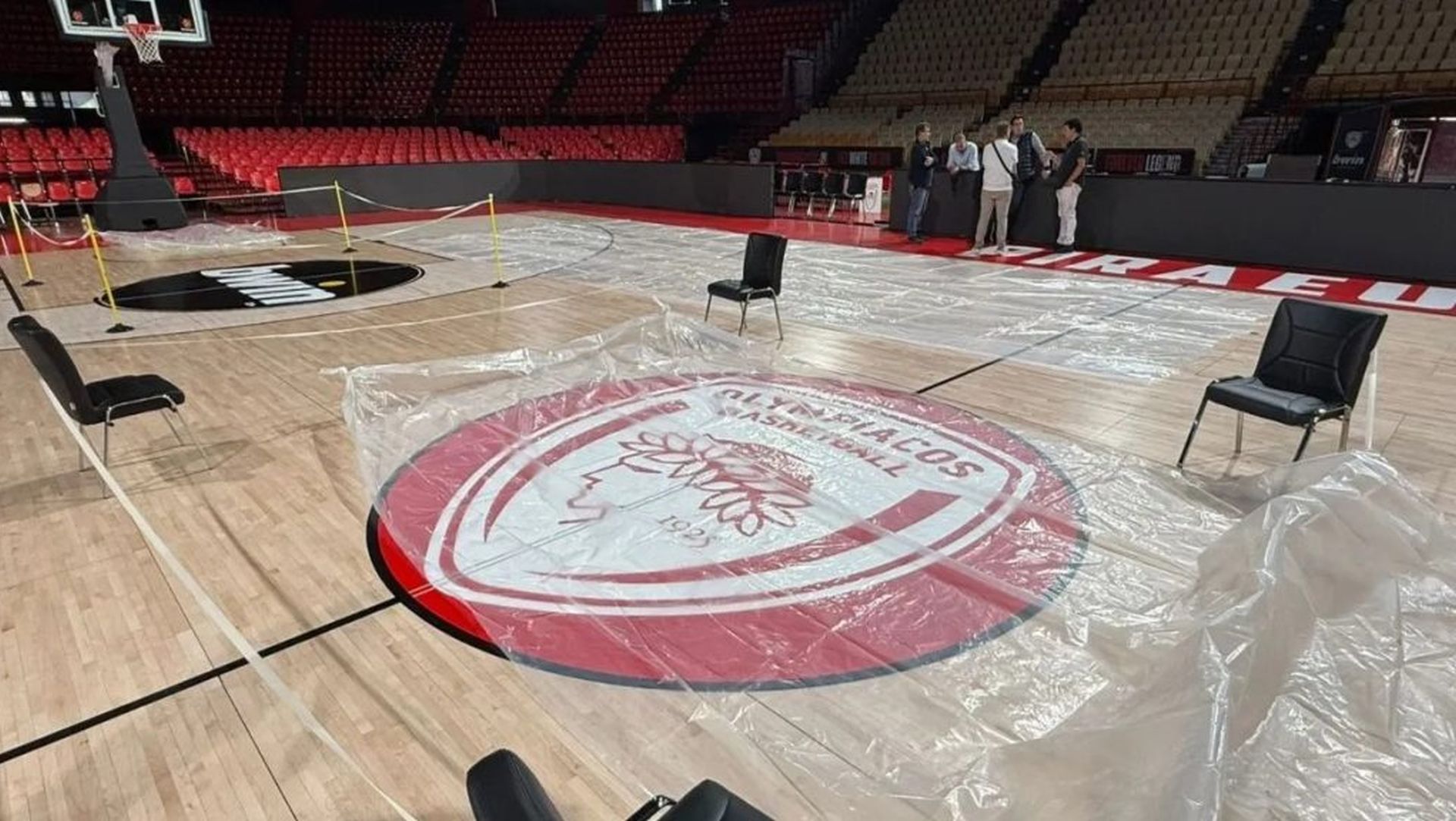 Το προσωπικό της ΚΑΕ Ολυμπιακός χρειάστηκε να σκεπάσει με νάιλον διάφορα σημεία προκειμένου να μην υπάρξουν ζημιές.