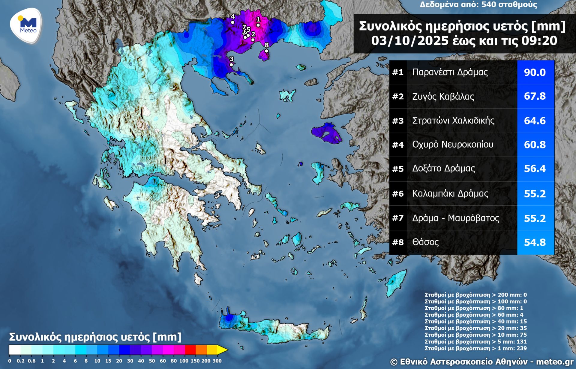 «Τα βόρεια ηπειρωτικά και νησιά του Βορείου και Ανατολικού Αιγαίου επηρέασε κυρίως η κακοκαιρία από την αρχή του εικοσιτετραώρου έως το πρωί της Παρασκευής 03/10. Στον χάρτη της εικόνας που ακολουθεί παρουσιάζεται η κατανομή του αθροιστικού υετού έως τις 09:20, σύμφωνα με το δίκτυο αυτόματων μετεωρολογικών σταθμών του meteo.gr / Εθνικού Αστεροσκοπείου Αθηνών, καθώς και οι 8 σταθμοί του δικτύου που κατέγραψαν τα μεγαλύτερα ύψη. Όπως προκύπτει, το μεγαλύτερο ύψος βροχής έως τις 09:20 της Παρασκευής 03/10 καταγράφηκε στο Παρανέστι Δράμας (90 χιλιοστά) ενώ και οι 8 σταθμοί βρίσκονται στην Κεντρική και Ανατολική Μακεδονία».