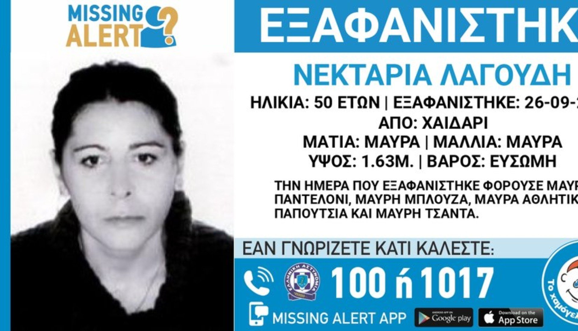 Η εξαφάνιση της Νεκταρίας Λαγούδη, 50 ετών, από το Χαϊδάρι σήμανε συναγερμό στις Αρχές. Τα ίχνη της χάθηκαν στις 26 Σεπτεμβρίου. Το «Χαμόγελο του Παιδιού» ενημερώθηκε το Σάββατο και προχώρησε στη δημοσιοποίηση των στοιχείων της, κατόπιν αιτήματος της οικογένειάς της, καθώς ενδέχεται να συντρέχουν λόγοι που θέτουν τη ζωή της σε κίνδυνο.