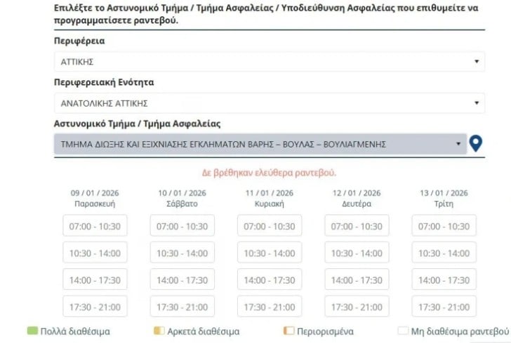 Στις περιοχές της Αττικής συγκεκριμένα στον Πειραιά, τον Νότιο Τομέα Αθηνών, τα Νησιά, την Ανατολική Αττική αλλά και στη Θεσσαλονίκη, δεν υπάρχουν διαθέσιμα ραντεβού για την έκδοση νέων ταυτοτήτων, γεγονός που επιβεβαιώνει τον αυξημένο φόρτο στα κεντρικά αστυνομικά τμήματα των μεγάλων πόλεων.