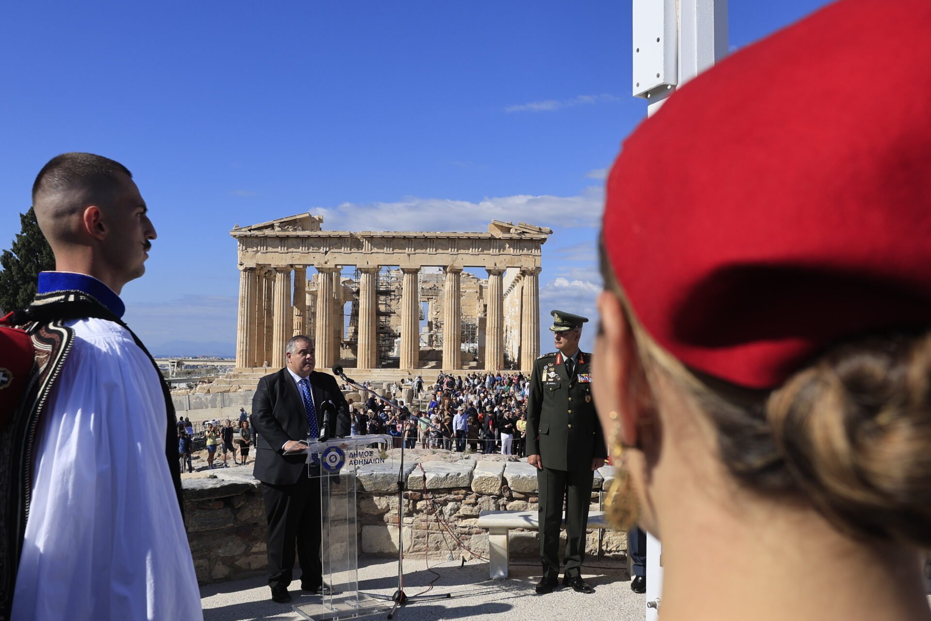 Σήμερα το πρωί, στον εμβληματικό χώρο του Ιερού Βράχου της Ακρόπολης, πραγματοποιήθηκε επίσημη τελετή έπαρσης της ελληνικής σημαίας για τον εορτασμό της 81ης επετείου. Η τελετή, με την παρουσία Ευζώνων της Προεδρικής Φρουράς, αποτέλεσε το επίκεντρο των επετειακών εκδηλώσεων.