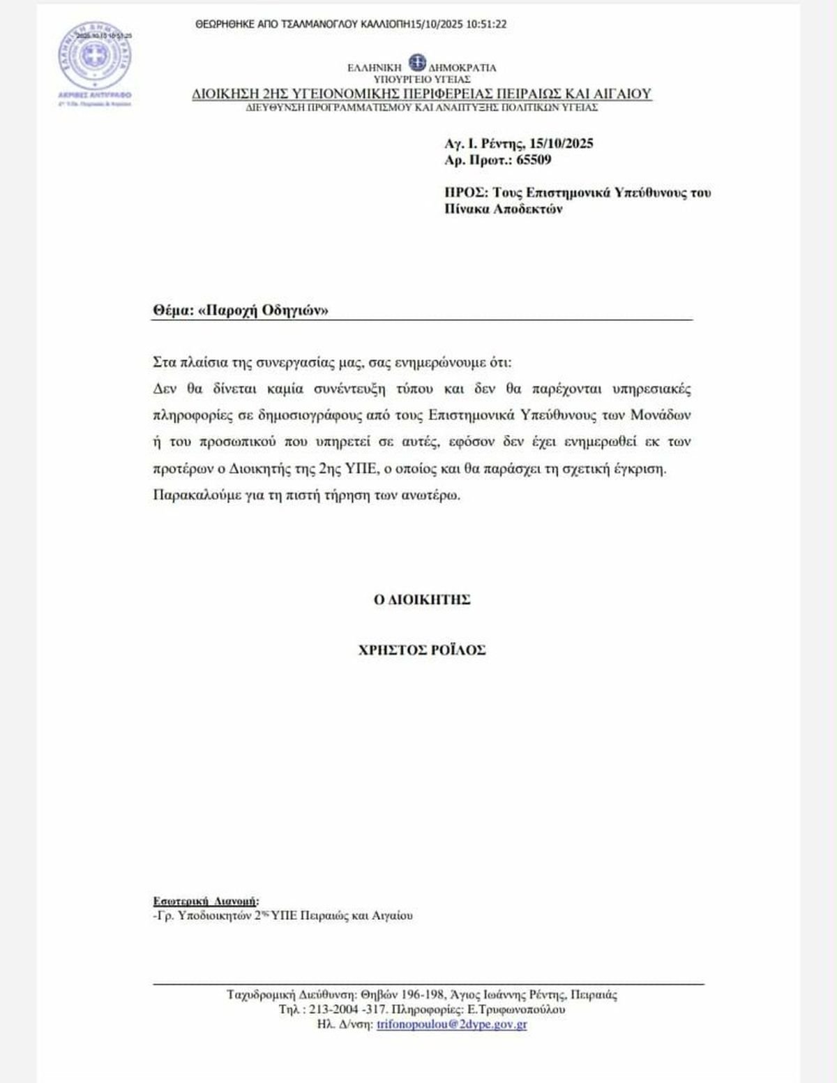 Αλγεινές εντυπώσεις προκαλεί το έγγραφο με το οποίο ο διοικητής της 2ης ΥΠΕ, Χρήστος Ροΐλος, «απαγορεύει» στους γιατρούς να επικοινωνούν με τα μέσα ενημέρωσης χωρίς να έχουν συνεννοηθεί πρώτα μαζί του.