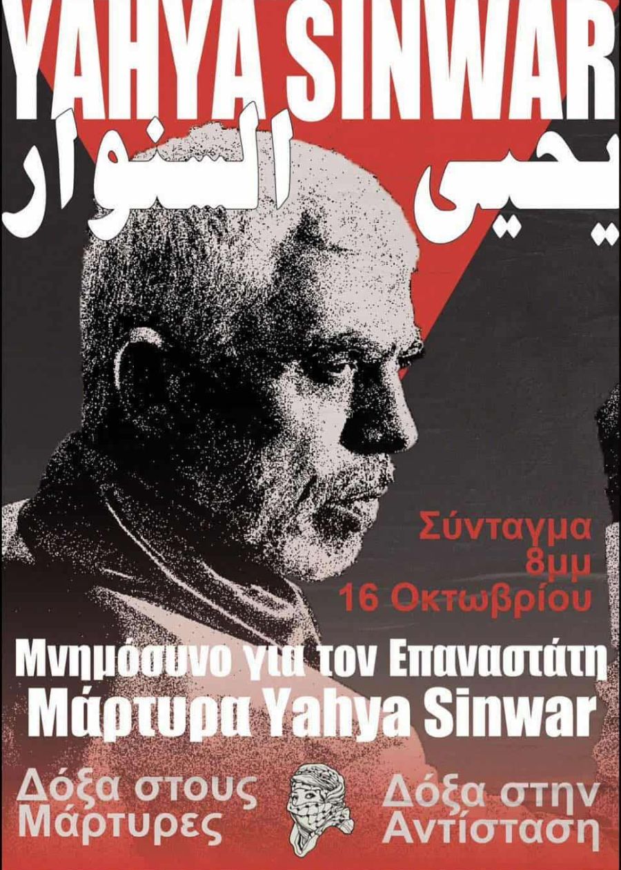 Η αφίσα που δημοσιοποιεί το newsbreak.gr δεν αφήνει περιθώρια παρερμηνειών. Πρόκειται για δημόσια απόδοση τιμών σε έναν άνθρωπο που υπήρξε ο εγκέφαλος της 7ης Οκτωβρίου 2023, της πιο αιματηρής τρομοκρατικής επίθεσης στη σύγχρονη ιστορία του Ισραήλ, έναν αρχιτέκτονα της βίας, υπεύθυνο για εκτελέσεις αντιφρονούντων στη Γάζα, για δεκάδες επιθέσεις αυτοκτονίας και για τη στρατολόγηση ανηλίκων σε πολεμικές επιχειρήσεις.