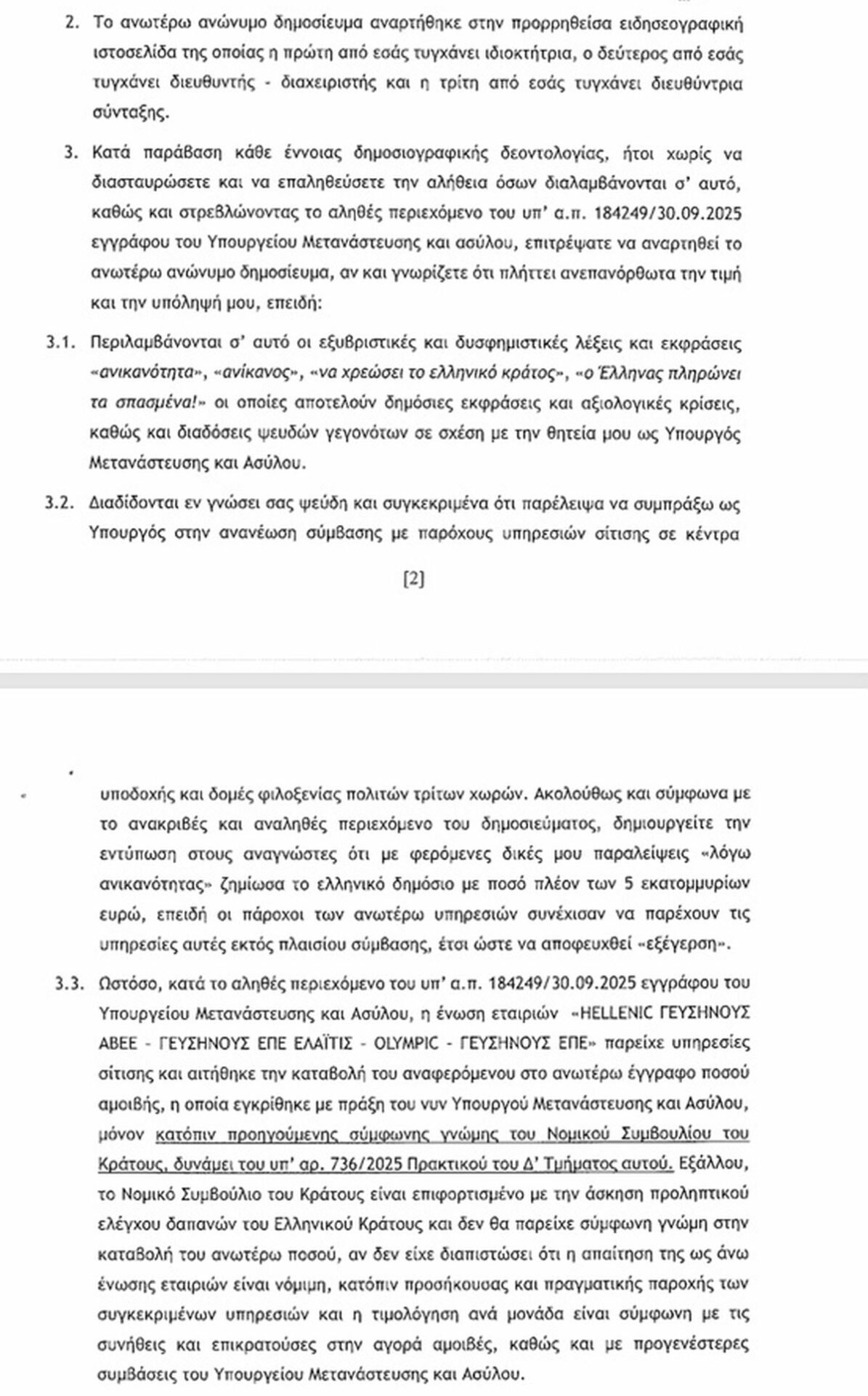 Ο κ. Καϊρίδης, μέσω του πληρεξουσίου δικηγόρου του, ζητά την ανάκληση του δημοσιεύματος με τίτλο «Δημήτρης Καϊρίδης: Πληρώνουμε εκατομμύρια την ανικανότητά του!», το οποίο αφορούσε τη θητεία του ως Υπουργού Μετανάστευσης και Ασύλου και συγκεκριμένα υπόθεση πληρωμής προς ένωση εταιριών παροχής υπηρεσιών σίτισης σε δομές φιλοξενίας προσφύγων.