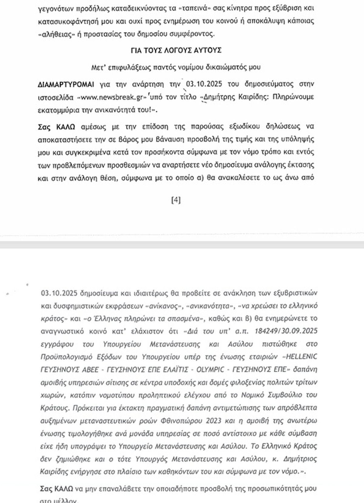 Στο εξώδικο, ο κ. Καϊρίδης χαρακτηρίζει το δημοσίευμα «εξυβριστικό και δυσφημιστικό» και υποστηρίζει ότι περιέχει ψευδείς ισχυρισμούς που προσβάλλουν την τιμή και την υπόληψή του. Στο πλαίσιο της δημοσιογραφικής δεοντολογίας και της διαφάνειας, το Newsbreak παραθέτει αυτούσιο το πλήρες κείμενο του εξωδίκου από την παράγραφο 2 και μετά, προκειμένου οι αναγνώστες μας να ενημερωθούν πλήρως για τις θέσεις και τους ισχυρισμούς του κ. Καϊρίδη.
