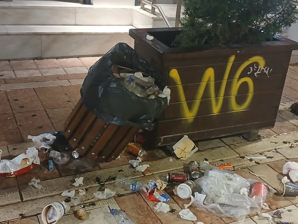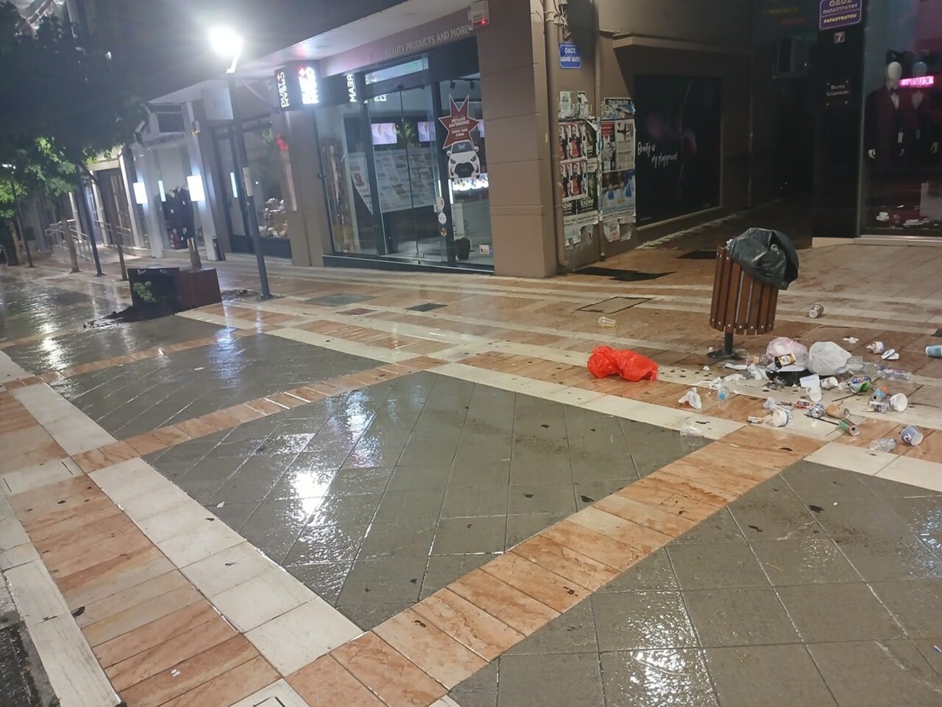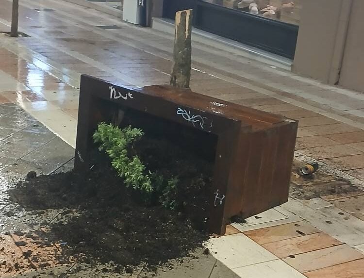 Ο πεζόδρομος της Παπαστράτου, η «καρδιά» της πόλης, μετατράπηκε μέσα σε λίγες ώρες σε σκηνικό χάους, με παρτέρια ξεριζωμένα, παγκάκια αναποδογυρισμένα και κάδους απορριμμάτων σπασμένους.