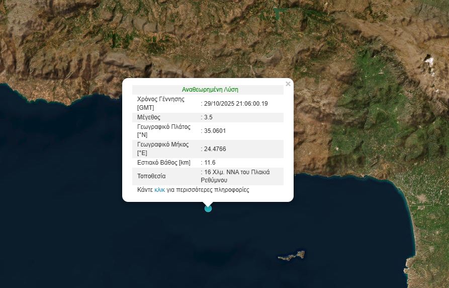 Σεισμική δόνηση μεγέθους 3,5 βαθμών της κλίμακας Ρίχτερ σημειώθηκε στην Κρήτη το βράδυ της Τετάρτης 29 Οκτωβρίου, στη θαλάσσια περιοχή νότια του Ρεθύμνου.