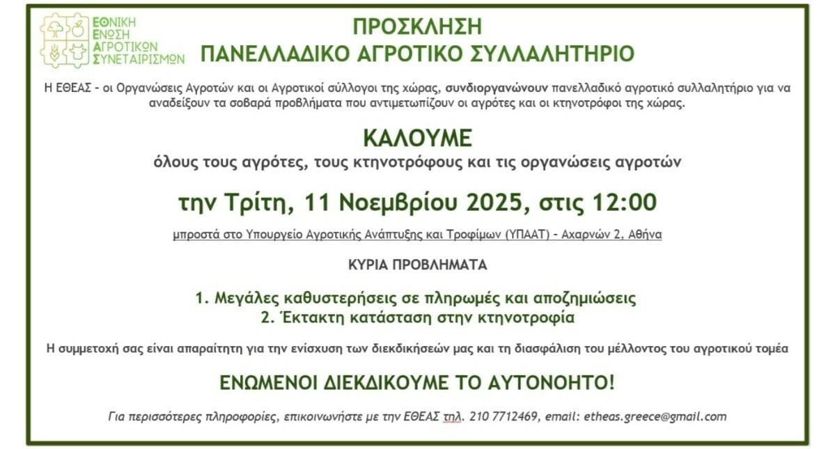 «Σήμερα, Τρίτη 4 Νοεμβρίου, πραγματοποιήθηκε η προγραμματισμένη τηλεδιάσκεψη – συντονιστική συνάντηση εκπροσώπων του αγροτικού και κτηνοτροφικού κόσμου, με στόχο τη συζήτηση των λεπτομερειών για το πανελλαδικό συλλαλητήριο που αποφασίστηκε κατά την ανοιχτή σύσκεψη της ΕΘΕΑΣ την Πέμπτη 23 Οκτωβρίου, σχετικά με τα συνεχιζόμενα προβλήματα που ταλανίζουν τον αγροκτηνοτροφικό τομέα. Η διαμαρτυρία αποφασίστηκε να πραγματοποιηθεί την Τρίτη, 11 Νοεμβρίου, στις 12:00, στο Υπουργείο Αγροτικής Ανάπτυξης και Τροφίμων, με τη συμμετοχή αγροτικών συνεταιρισμών, αγροτικών συλλόγων, ομοσπονδιών, παραγωγών και κτηνοτρόφων από όλη τη χώρα.