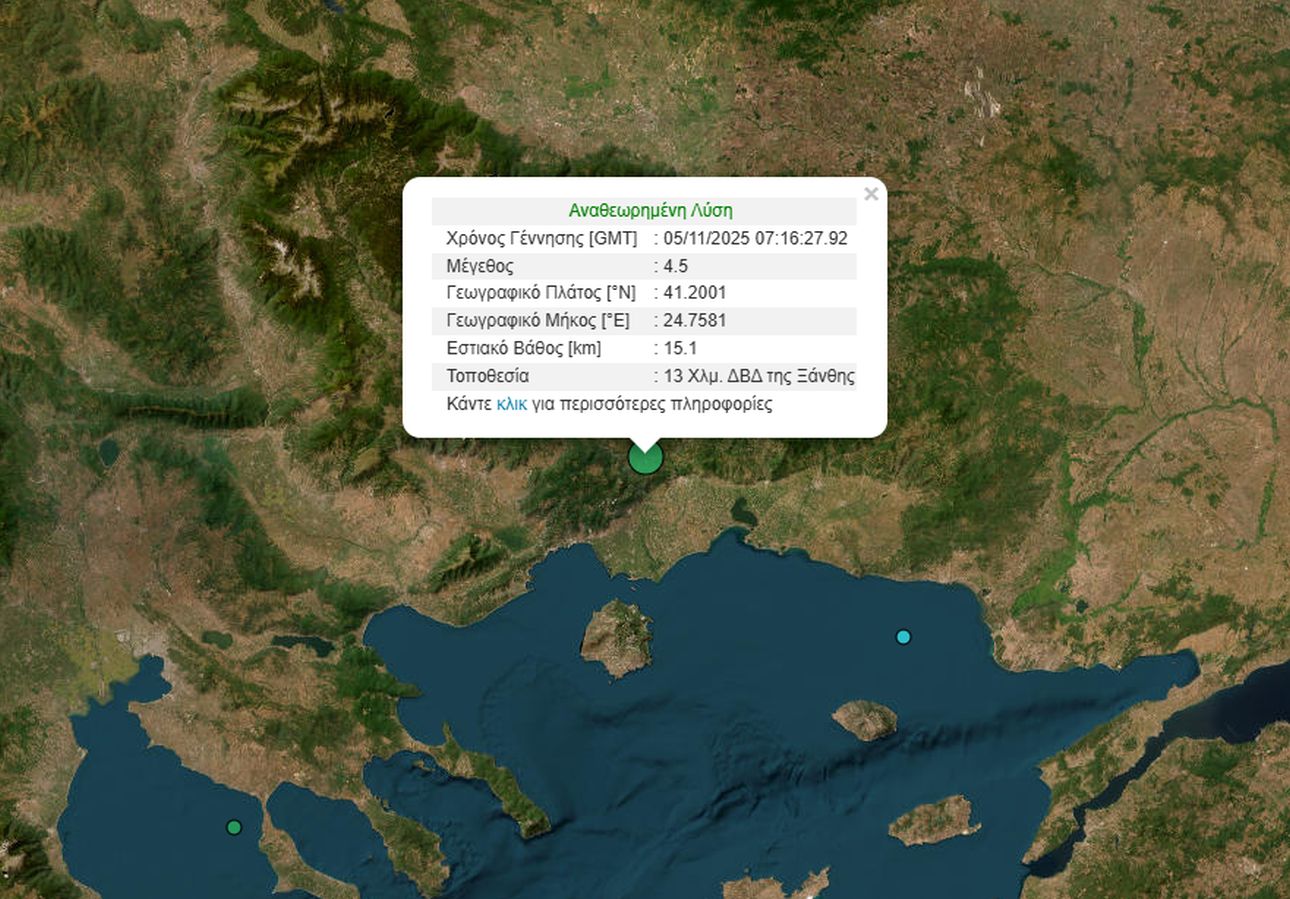Σεισμική δόνηση μεγέθους 4,5 βαθμών της κλίμακας Ρίχτερ ταρακούνησε λίγα λεπτά μετά τις 9 σήμερα Τετάρτη (5/11) το πρωί την Ξάνθη.