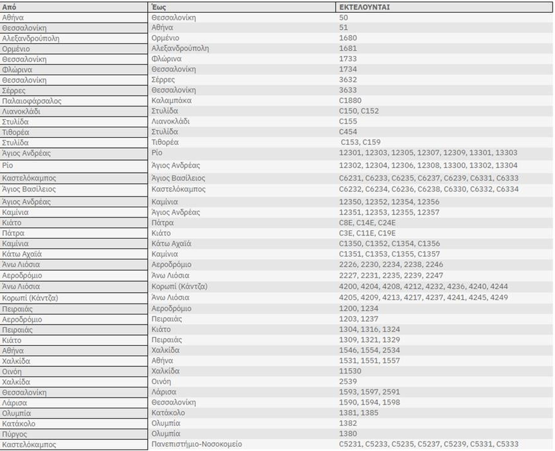Ωστόσο δημοσίευσε έναν πίνακα με τα δρομολόγια που θα πραγματοποιηθούν. Όπως επισημαίνει η εταιρεία τα δρομολόγια με τη σήμανση C θα γίνουν με λεωφορεία.