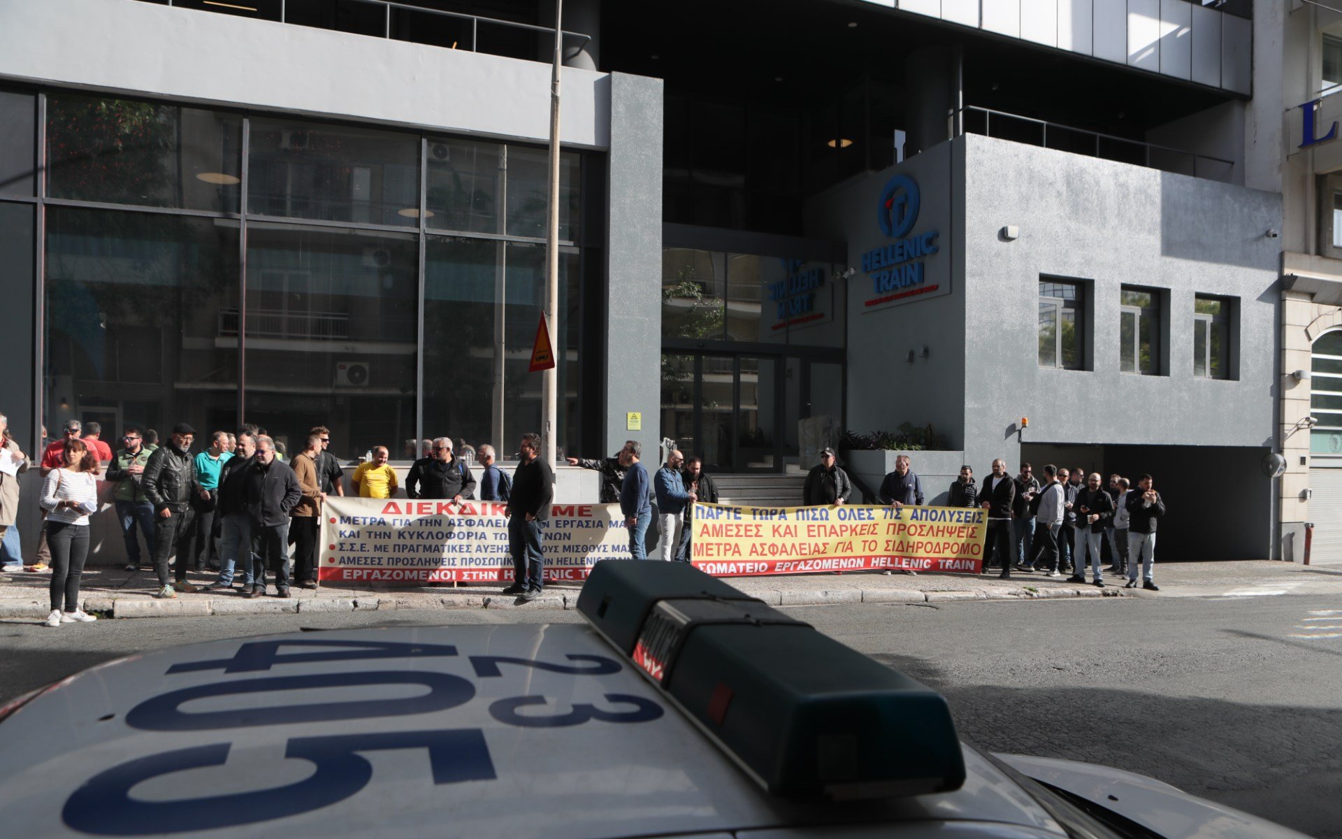 Διαμαρτυρία έξω από τα γραφεία της Hellenic Train στην Αθήνα. Οι εργαζόμενοι της εταιρείας συγκεντρώθηκαν την Τρίτη στο πλαίσιο της 24ωρης πανελλαδικής απεργίας που κήρυξαν σωματεία του ελληνικού σιδηροδρόμου.
