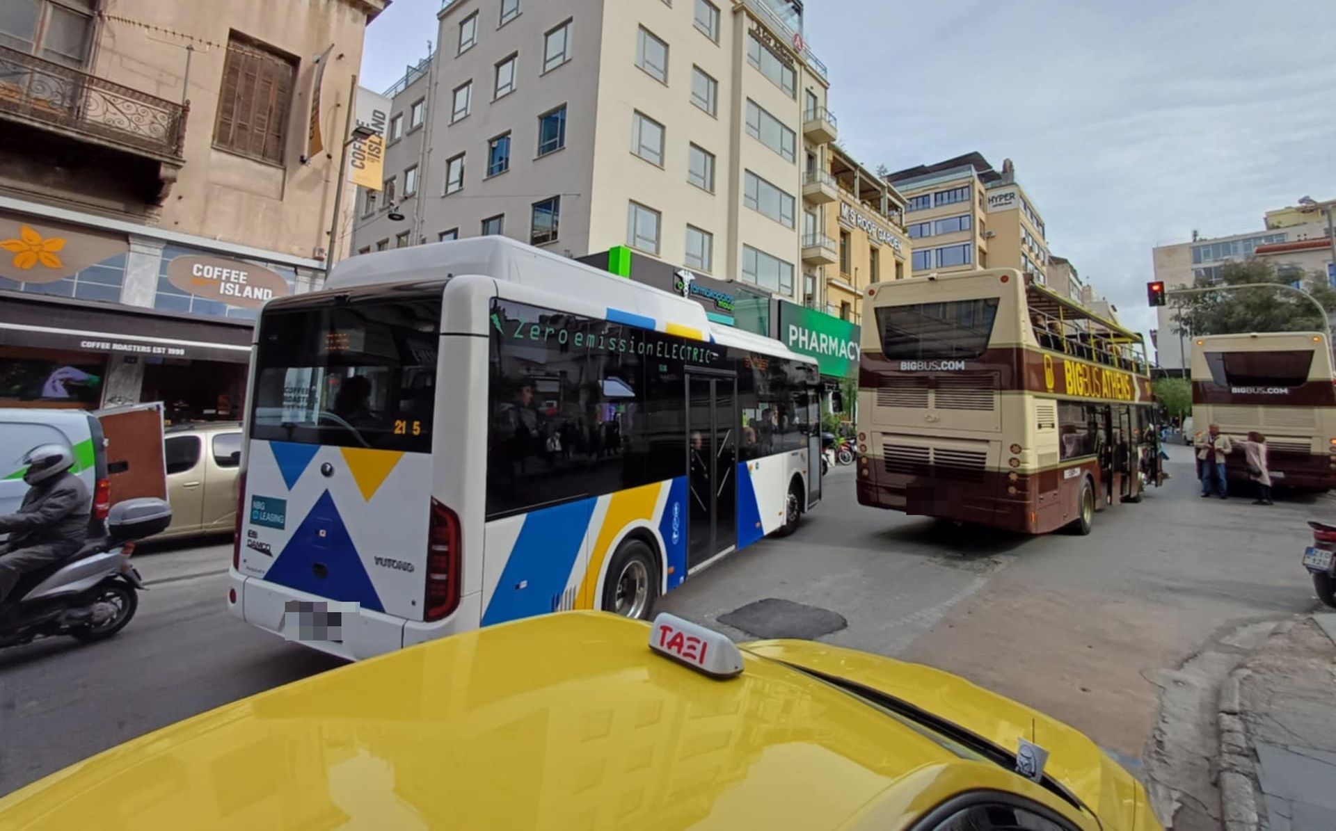 Τα ογκώδη διώροφα λεωφορεία πιάνουν την μια λωρίδα κυκλοφορίας με αποτέλεσμα να μένει μόνο μια λωρίδα για τα υπόλοιπα οχήματα που διέρχονται από τον πολυσύχναστο δρόμο.