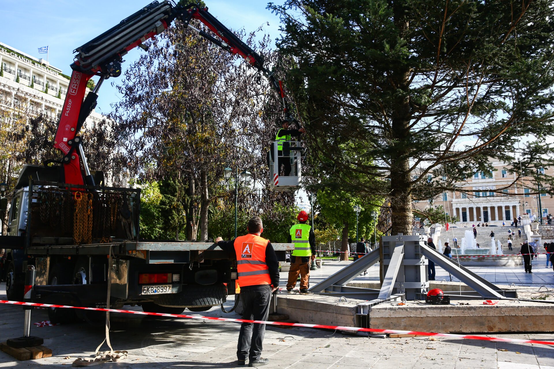 Το πρωί της Παρασκευής 21/11 έφτασε την πλατεία Συντάγματος και τοποθετήθηκε με έναν τεράστιο γερανό το Χριστουγεννιάτικο δέντρο που θα κοσμεί την πρωτεύουσα για τον επόμενο περίπου έναμιση μήνα.