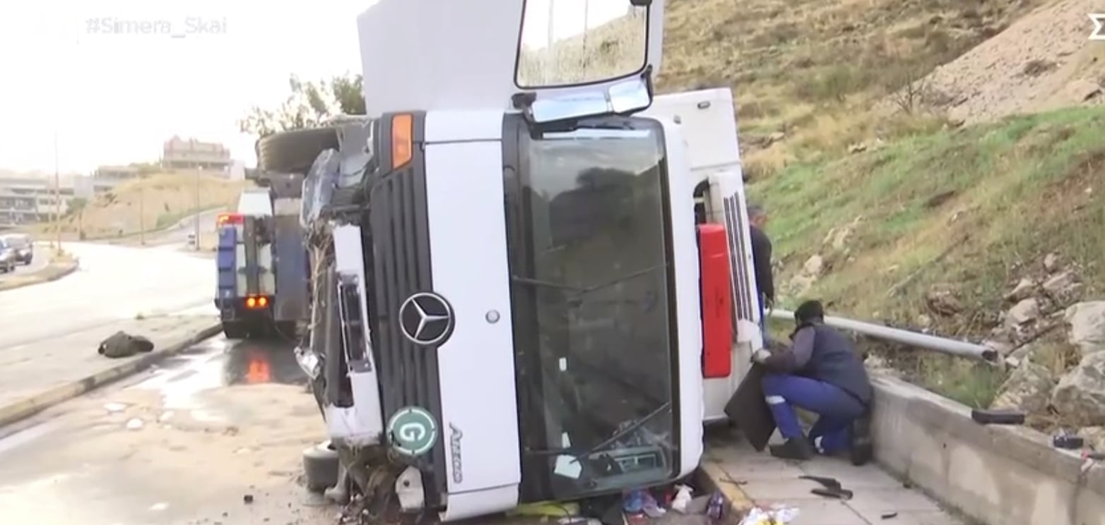 Κάποια στιγμή, ο οδηγός έχασε τον έλεγχο του φορτηγού, αυτό ανατράπηκε και ντεραπάρισε.