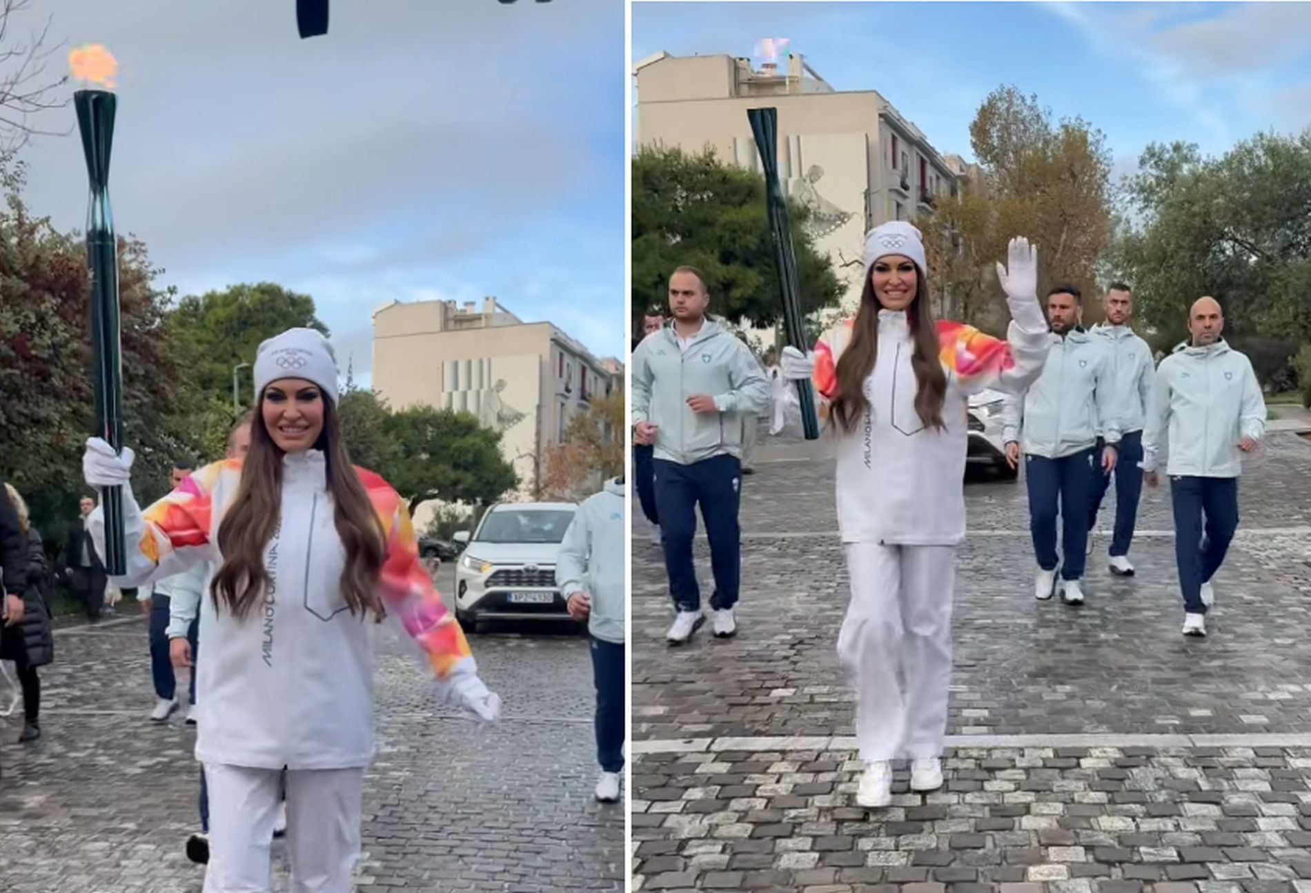 Λαμπαδηδρόμος με τη στολή των Χειμερινών Ολυμπιακών Αγώνων Milano Cortina 2026 έγινε η Κίμπερλι Γκίλφοϊλ, η οποία διέσχισε την Διονυσίου Αρεοπαγίτου με την Ολυμπιακή Φλόγα γεμάτη χαμόγελα και χαιρετούρες προς τον κόσμο που ήταν συγκεντρωμένος.