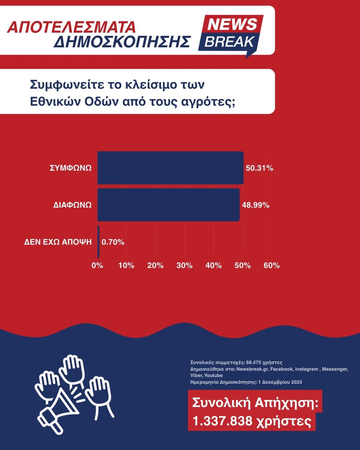 Στο ερώτημα «Συμφωνείτε με το κλείσιμο των εθνικών οδών από τους αγρότες;» οι απαντήσεις ήταν εντυπωσιακά διχασμένες: