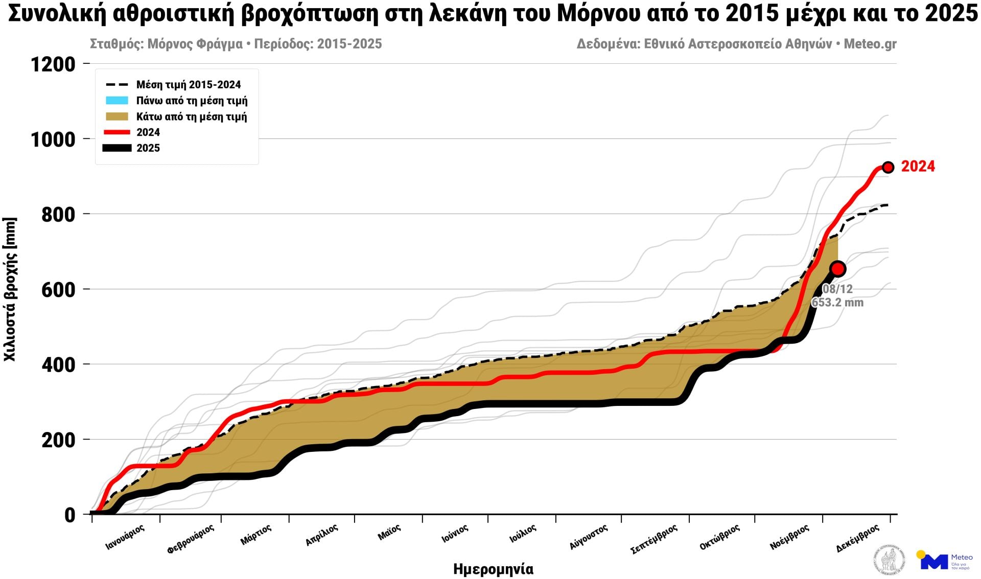 Ανησυχητικά είναι τα στοιχεία του meteo του Εθνικού Αστεροσκοπείου Αθηνών για τον ταμιευτήρα του Μόρνου, που υδροδοτεί την πρωτεύουσα. «Σύμφωνα με τις καταγραφές του δικτύου μετεωρολογικών σταθμών του ΜΕΤΕΟ/ΕΑΑ, το τετραήμερο 03-06/12/2025, μόνο 43 χιλιοστά καταγράφησαν στο σταθμό του Κονιάκου και 49 χιλιοστά στο σταθμό στο Φράγμα Μόρνου», σημειώνουν οι επιστήμονες του Εθνικού Αστεροσκοπείου.