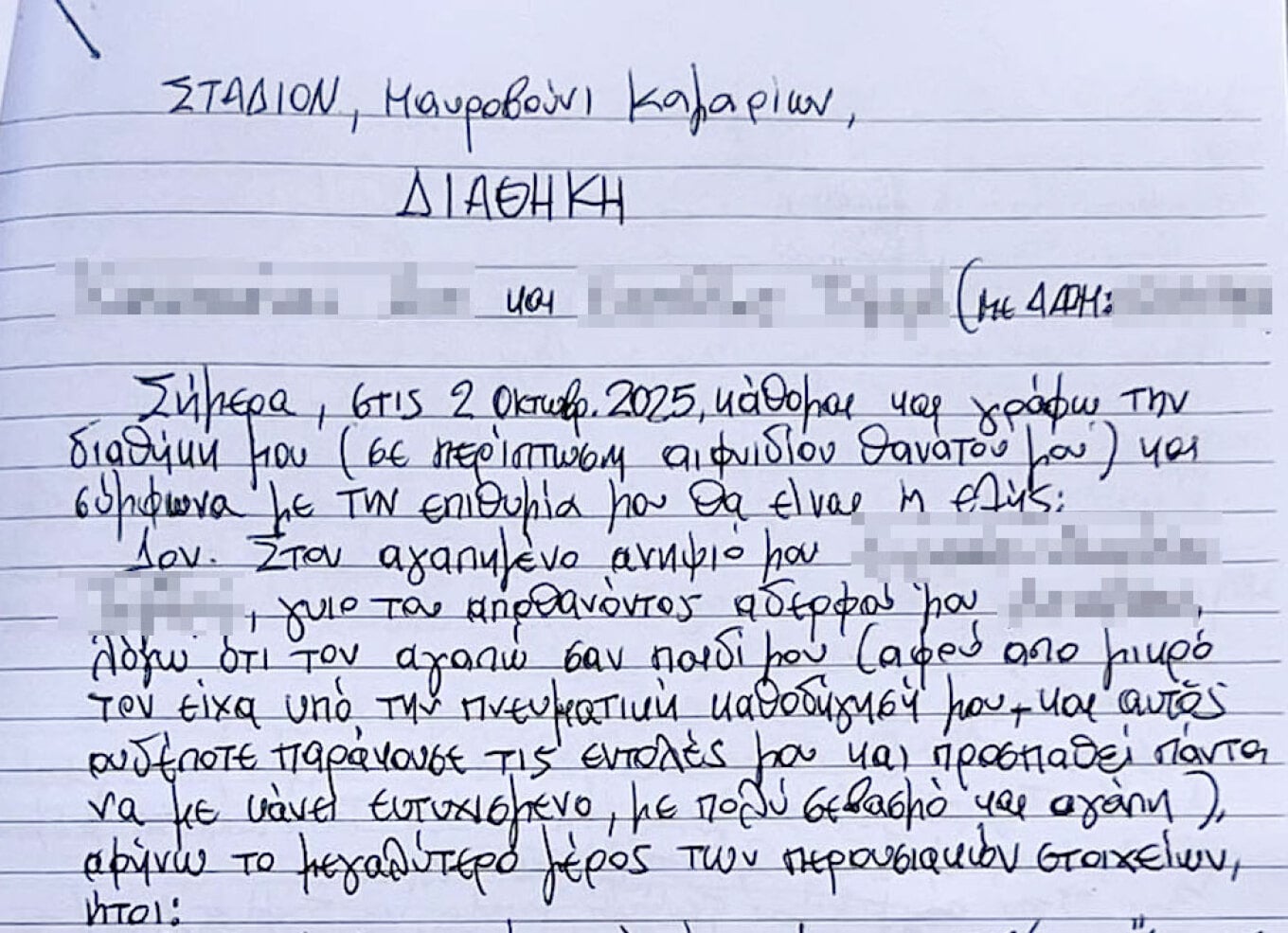 Λίγες ώρες μετά τη σύλληψη, αποκαλύφθηκε το περιεχόμενο της διαθήκης που είχε συντάξει ο 68χρονος μόλις τρεις ημέρες πριν από το φονικό. Η αρχή της διαθήκης αποτυπώνει μια προαίσθηση κινδύνου: «Γράφω τη διαθήκη μου σε περίπτωση αιφνιδίου θανάτου μου».