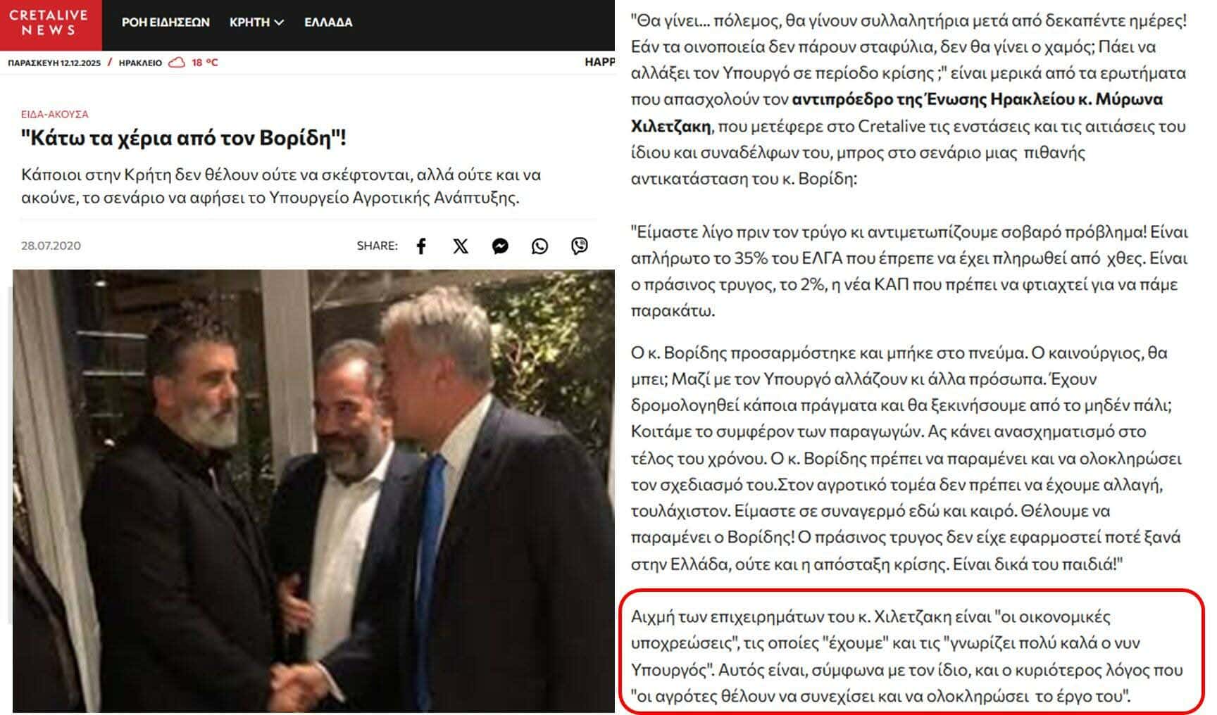 Η ειρωνεία και το θράσος της υπόθεσης κορυφώνεται, αν ανατρέξει κανείς στις δηλώσεις που είχε κάνει ο Μύρων Χιλετζάκης μόλις λίγους μήνες πριν, στις αρχές του καλοκαιριού του 2025 (σ.σ. Ιούνιος 2025), σε εκπομπή, μετά τη συνάντησή του με την ηγεσία του Υπουργείου Αγροτικής Ανάπτυξης.