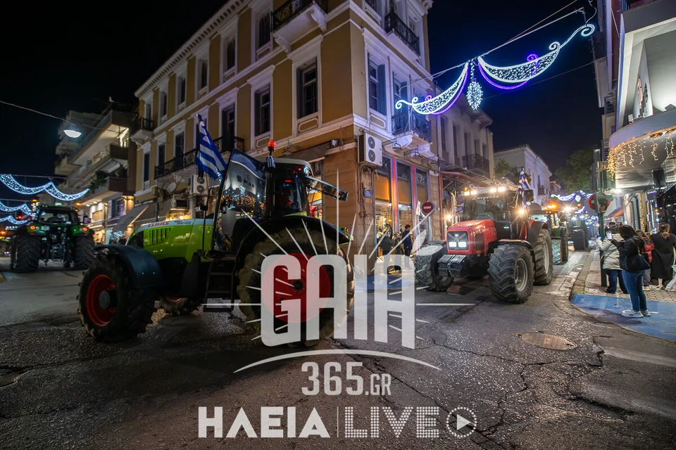 Στον Πύργο οι αγρότες προχώρησε σε νυχτερινή πορεία με τα τρακτέρ τους στο κέντρο της πόλης.
