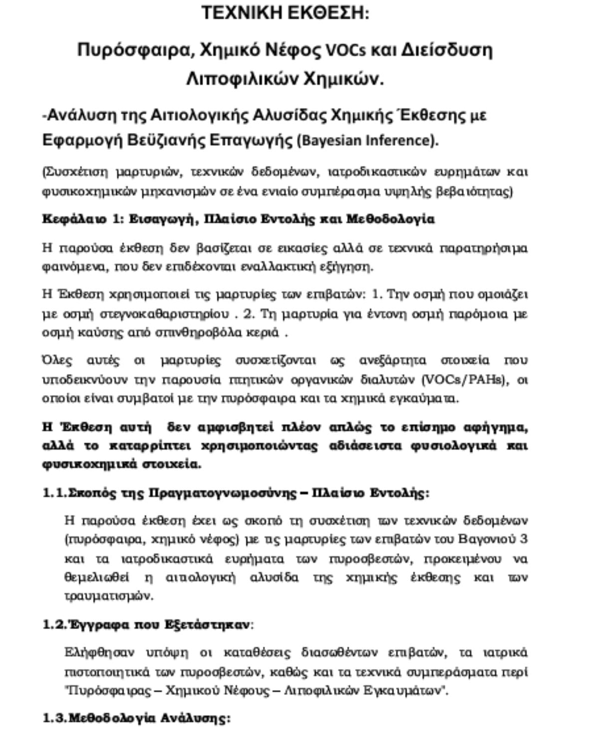 «Αξιοποιούμε μαρτυρίες αυτοπτών μαρτύρων τις οποίες συνδυάζουμε με τα ευρήματα του Γενικού Χημείου του Κράτους, τις Ιατροδικαστικές εκθέσεις κ.α.. Η έκθεση βασίζεται σε αντικειμενικά παρατηρήσιμα φαινόμενα και αποδεικνύει την αιτιολογική σύνδεση μεταξύ του πρωτογενούς θερμικού φαινομένου, του δευτερογενούς χημικού νέφους και των ιατροδικαστικών τραυμάτων», αναφέρει.