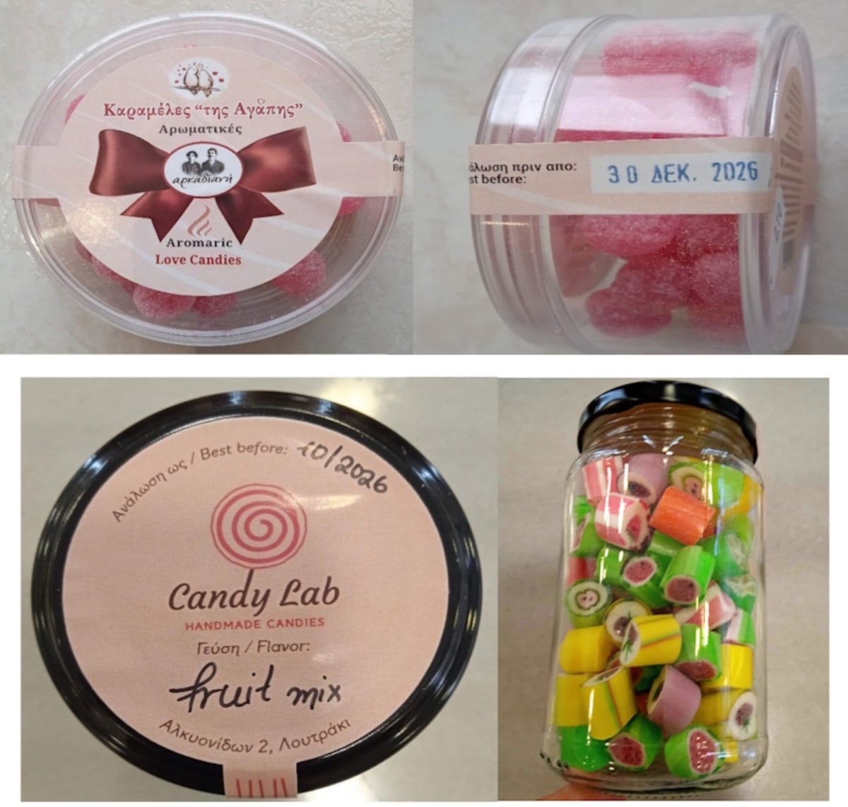 Καραμέλες “της Αγάπης-Αρωματικές” με ημερομηνία ανάλωσης πριν από τις 30 ΔΕΚ. 2026, συσκευασίας καθαρού βάρους περίπου 110g της εταιρείας με διακριτικό τίτλο “αρκαδιανή” που εδρεύει στο Ψάρι Αρκαδίας.