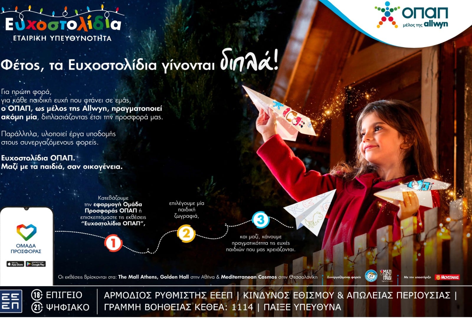 Για πρώτη φορά, μάλιστα, ο ΟΠΑΠ, μέλος της Allwyn, διπλασιάζει την προσφορά στα παιδιά, αφού για κάθε ευχή που πραγματοποιούμε, εκπληρώνει ακόμη μία εκ μέρους μας.