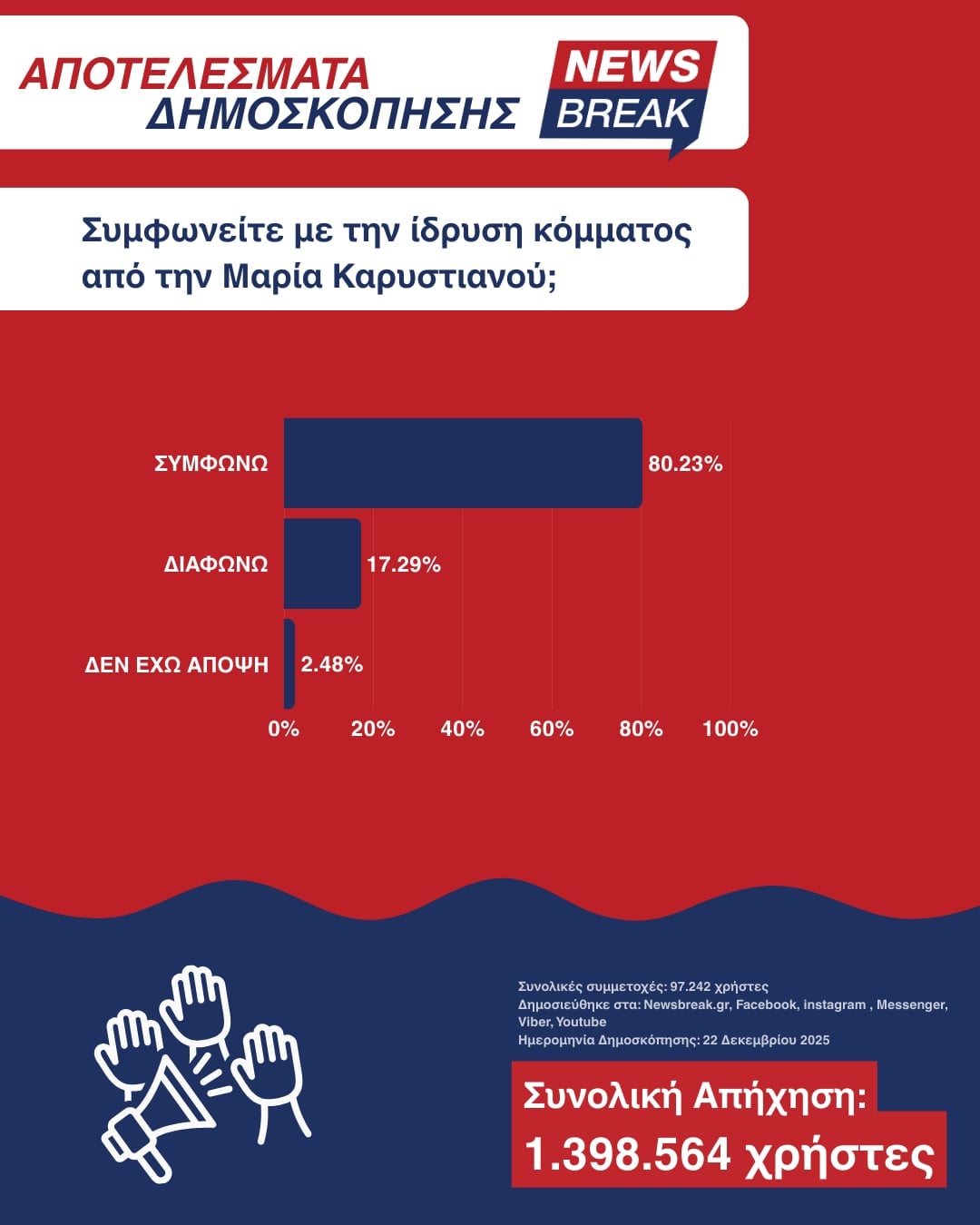 Ιδιαίτερα ηχηρό αποτύπωμα άφησε η δημοσκόπηση του Newsbreak με ερώτημα: «Συμφωνείτε με την ίδρυση κόμματος από τη Μαρία Καρυστιανού;», προκαλώντας έντονη κινητοποίηση και συζήτηση στο κοινό.